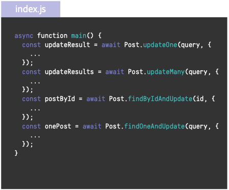 - MongoDB의 query는 BSON 형식으로, 기본 문법 그대로 mongoose에서도 사용 가능