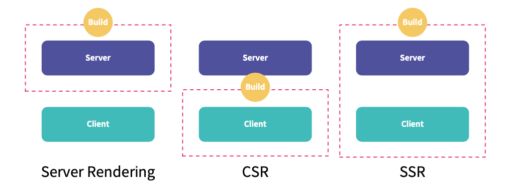 • React, Vue, Angular 등 자바스크립트 프레임워크가 나오기 이전 초기 웹 환경에서는 모든 페이지를 서버에서 빌드.